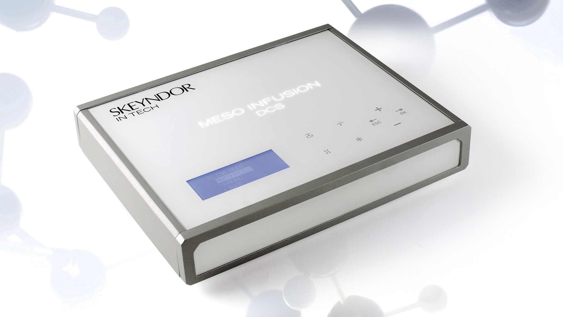 MESO INFUSION DCS ist ein Gerät für kosmetische Behandlungen unter Verwendung chemischer Produkte (Kosmetika) mittels elektrostatischer Techniken wie Aktivierungsstrom, Hydroelektrizität, Kryopherese und E-Poration, welche auch als Mesotherapie oder virtuelle „Nadel“ bekannt ist.